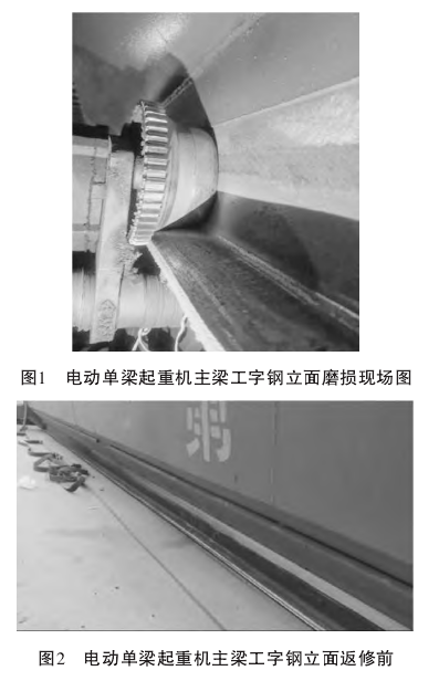 下面是檢驗(yàn)過程中發(fā)現(xiàn)的電動單梁起重機(jī)主梁工字鋼立面磨損圖片(見圖1),以及吊至地面準(zhǔn)備返修前的圖片(見圖2)。主梁工字鋼磨損常見表現(xiàn)形式為立面磨損出金屬光澤。