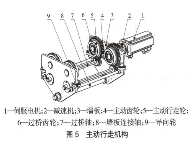 墻板是電動葫蘆行走機構的主要結構件,與過橋軸、墻板連接軸一起組成行走機構的結構框架。墻板分為左右兩塊,右側墻板固定有減速機,減速機一端固定有伺服電機,另一端固定有主動齒輪。主動齒輪與兩個固定在右側墻板上的主動行走輪嚙合,主動行走輪與固定在右側墻板上的過橋齒輪嚙合,過橋齒輪連接過橋軸,驅動固定在左側墻板上的過橋齒輪,進而驅動固定在左側墻板上的主動行走輪,實現電動葫蘆行走機構四個主動行走輪的同步運行。