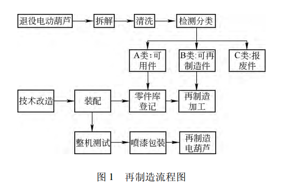 電動葫蘆的再制造主要步驟包括回收和初步檢查、拆解、清洗、檢查分類、再制造加工、在裝配以及整機測試,其流程如圖1所示。